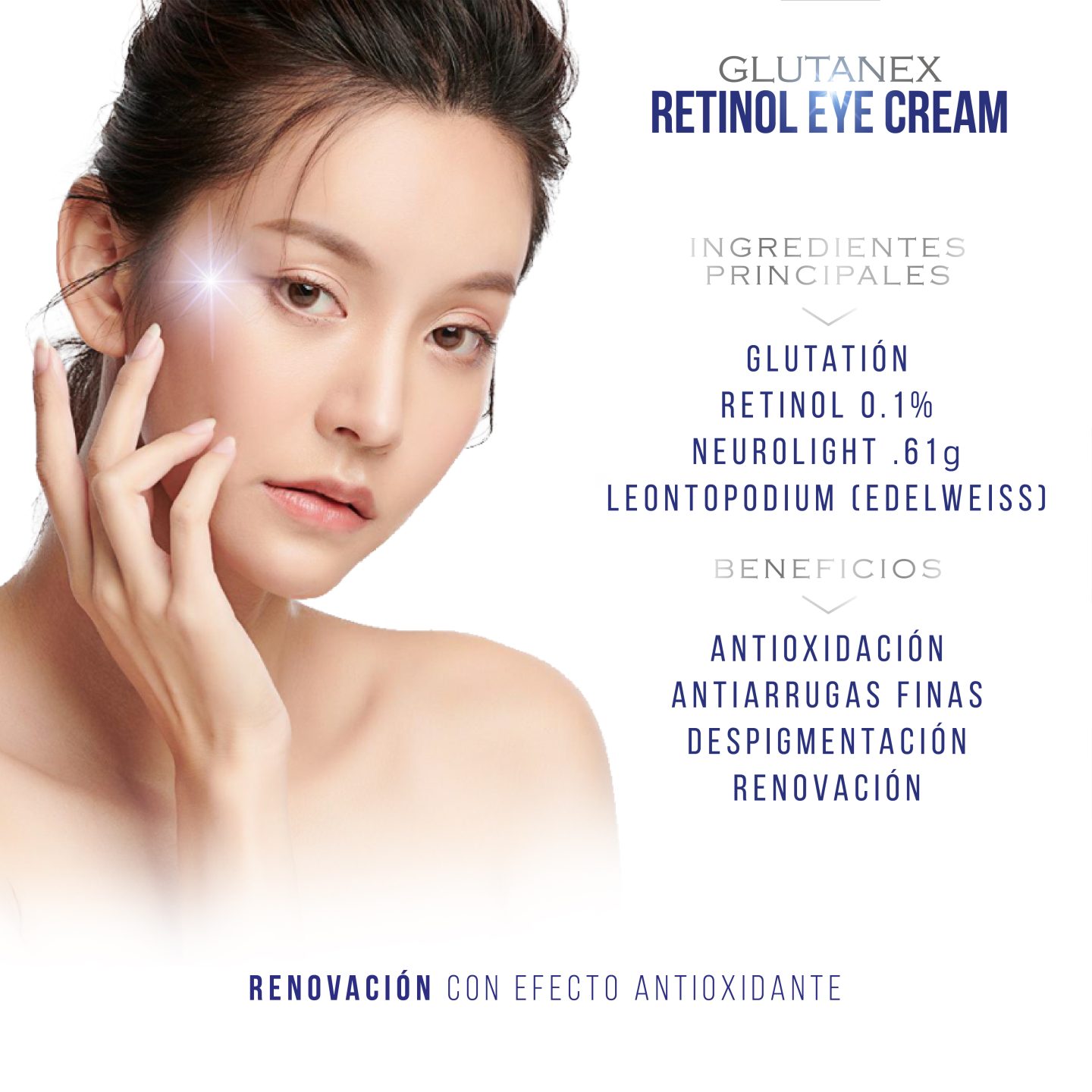 GLUTANEX™ RETINOL EYE CREAM Crema Despigmentante, Renovadora y Antioxidante Contorno de Ojos con Glutatión, Retinol 0.1%, Neurolight .61G y Leontopodium (30ml.)